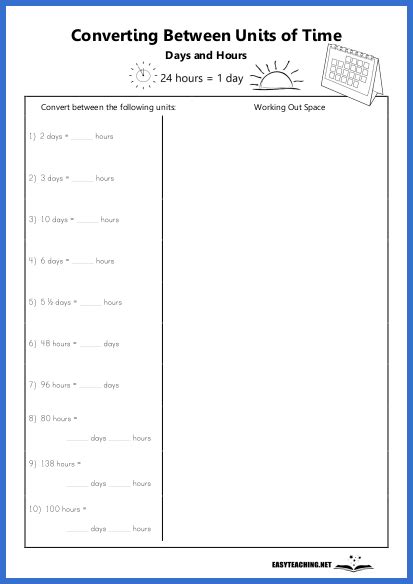 If you’re working with a large dataset or need to perform multiple conversions, spreadsheets like Microsoft Excel or Google Sheets can be incredibly useful. You can create a simple formula to convert hours to days, and then apply that formula to an entire column of data. This is a great way to automate the conversion process and save time. The formula is simply: