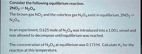 First, let’s get the basics down. The chemical equation 2NO2 ⇌ N2O4 represents the reversible reaction between nitrogen dioxide (NO2) and dinitrogen tetroxide (N2O4). Nitrogen dioxide (NO2) is a reddish-brown gas, while dinitrogen tetroxide (N2O4) is a colorless gas. The double arrow (⇌) indicates that the reaction can proceed in both directions: the forward reaction (2NO2 → N2O4) and the reverse reaction (N2O4 → 2NO2).