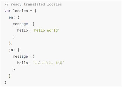 In this example, we import VueI18n and use it as a Vue plugin. We then create an i18n instance and configure it with our languages and translation messages. The locale option specifies the default language, and the messages option contains the translations for each language. Finally, we pass the i18n instance to our Vue app.