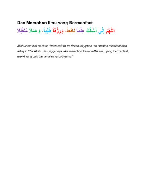 Oke, guys, setelah kita paham kenapa pentingnya doa ilmu yang bermanfaat , sekarang kita masuk ke intinya nih. Gimana sih bentuk doanya? Rumaysho, lewat berbagai kajian dan tulisannya, sering banget ngajarin kita doa-doa dari Al-Qur’an dan Sunnah yang bisa kita amalkan. Salah satu doa yang paling sering disebut dan sangat relevan adalah doa yang diajarkan oleh Nabi Muhammad SAW: “ Allahumma inni as-aluka ‘ilman naafi’an, wa rizqan thayyiban, wa amalan mutaqabbalan. ” Kalau diartikan, artinya kira-kira begini, “ Ya Allah, sesungguhnya aku memohon kepada-Mu ilmu yang bermanfaat, rezeki yang baik (halal), dan amal yang diterima. ” Keren, kan? Doa ini singkat tapi padat makna. Dia nggak cuma minta ilmu aja, tapi langsung nyambung sama rezeki yang halal dan amal yang diterima . Ini nunjukkin banget kalau ilmu yang bermanfaat itu adalah ilmu yang membawa kebaikan di semua lini kehidupan kita, nggak cuma buat nambah wawasan, tapi juga buat mengatur hidup kita jadi lebih baik, baik di dunia maupun di akhirat nanti. Coba bayangin, guys, punya ilmu tapi rezekinya haram? Atau punya ilmu tapi amalnya nggak diterima Allah? Kan percuma banget, ya? Makanya doa ini lengkap banget. Kita minta biar ilmunya bermanfaat , rezekinya berkah , dan ibadahnya diterima . Ini adalah paket komplit buat kita yang pengen hidupnya sukses dunia akhirat . Rumaysho menekankan pentingnya mengulang doa ini, apalagi di waktu-waktu mustajab seperti setelah salat fardhu, di sepertiga malam, atau saat sujud. Jangan cuma dihafal teksnya, tapi resapi maknanya, guys. Lakukan dengan penuh keyakinan dan tadharru’ (kerendahan hati). Rasakan setiap kata yang terucap, bayangkan kebesaran Allah yang Maha Mendengar dan Maha Mengabulkan. Doa ini bukan sekadar ritual, tapi pernyataan niat kita untuk menjadi hamba-Nya yang cerdas, produktif, dan taat. Jadi, yuk, mulai sekarang jadikan doa ini rutinitas harian kita, guys. Jangan sampai kita kehilangan kesempatan emas ini untuk meminta langsung kepada Sang Maha Pemberi.