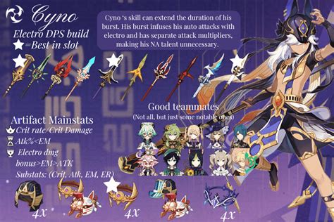 Now, let’s talk artifacts for Cyno . His go-to set, hands down, is 4-piece Gladiator’s Finale . This set provides a massive 18% ATK bonus with just two pieces, and the full four-piece effect grants a 35% Normal Attack damage bonus when the wearer uses a Sword, Claymore, or Polearm . Since Cyno’s damage during his Burst is heavily reliant on his Normal Attacks, this set is an absolute no-brainer. It significantly boosts his overall damage output, making every hit count. If you happen to have a well-substatted 4-piece Thundering Fury set, that’s also a very viable option, especially for Aggravate teams. The two-piece bonus gives a 15% Electro DMG Bonus, and the four-piece effect reduces the cooldown of Elemental Skills and increases the damage dealt by Electro-Charged, Overloaded, and Hyperbloom reactions by 40%, and by 20% for Aggravate and Superconduct. This can lead to more frequent Skill usage and a slight damage increase in specific team comps. However, for raw damage and general usability, Gladiator’s Finale often edges it out. When it comes to artifact main stats, you’ll want to prioritize ATK% Sands , Electro DMG Bonus Goblet , and CRIT Rate or CRIT DMG Circlet . The choice between CRIT Rate and CRIT DMG on your Circlet depends on your weapon and substats – aim for a 1:2 ratio. For substats, stack CRIT Rate, CRIT DMG, ATK%, and Elemental Mastery . Elemental Mastery is particularly important for Cyno due to his Ascension passive and the Staff of the Scarlet Sands. Getting a good balance of these stats will make a world of difference in his damage potential. Remember, farming artifacts is a marathon, not a sprint, so keep at it, guys!