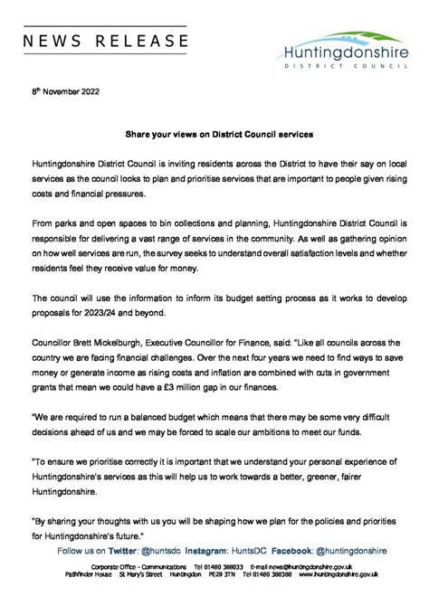 Want to get in touch with the Huntingdon District Council directly? Here’s how: The council’s website is the central hub for all things Huntingdonshire. You’ll find a wealth of information, from details about services and events to contact information for councillors and staff. You can also use the website to report issues, pay bills, and access online services. The council is also active on social media. You can follow them on platforms like Facebook and Twitter to stay up-to-date with the latest news, events, and announcements. If you prefer to speak to someone in person or over the phone, the council has a contact centre that is open during office hours. You can find the phone number and address on the website. Also, there are a number of useful resources available to residents. The council publishes a newsletter that is delivered to all households. It keeps you informed about council activities, local events, and important announcements. There are also a variety of guides and leaflets available. You can download these from the website or pick them up at the council offices. These resources provide information on a wide range of topics, from waste and recycling to planning and development.