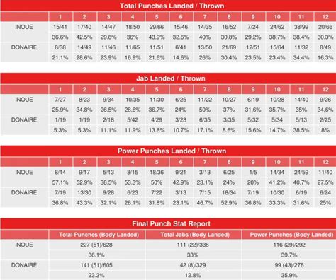 While we don’t have exact round-by-round punch stats readily available for public consumption in a detailed breakdown, we can infer trends. Early on, Donaire likely had moments where he matched or even out-landed Inoue, particularly with his sharp, precise counter-punches. He caught Inoue clean on a few occasions, reminding everyone of his power. However, as the fight progressed into the middle and later rounds, Inoue’s volume and body work began to pay dividends. You could see Inoue’s landed punches accumulating, while Donaire’s output, though still dangerous, became more measured. This is typical of a fighter like Inoue, who applies relentless pressure and gradually breaks his opponents down. The statistical evidence points to Inoue increasing his effectiveness and landing volume as the fight wore on, a hallmark of his championship pedigree. His ability to maintain a high level of offensive output while absorbing Donaire’s best punches is what ultimately secured his victory.