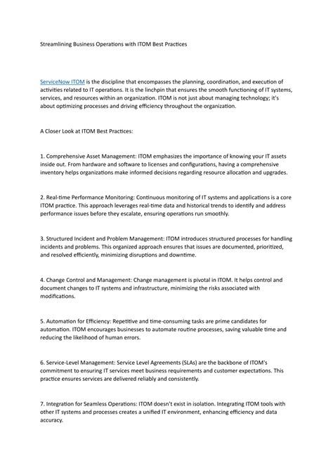 ITOM is not a one-time project; it’s an ongoing process. Organizations should continuously monitor their ITOM performance, identify areas for improvement, and implement changes to optimize their IT operations. This requires a culture of continuous learning and a willingness to adapt to changing business requirements. It’s about always striving to be better.