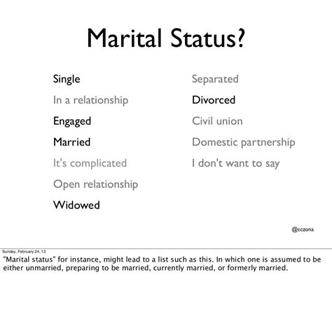 Beyond the usual suspects, there are some other marital status options that you might come across. These aren’t as common, but they’re worth knowing about. “Annulled” means that a marriage was declared invalid from the start, as if it never happened. This is different from divorce, which terminates a valid marriage. Annulments are typically granted in cases of fraud, duress, or other legal impediments. Then there’s “domestic partnership,” which is a legal relationship between two individuals who live together and share a common household, but are not married. Domestic partnerships offer some of the same rights and benefits as marriage, but they may not be recognized in all states or countries. Finally, there’s “civil union,” which is similar to domestic partnership but may offer more comprehensive rights and benefits. Civil unions are typically recognized at the state level, but not at the federal level. These alternative marital statuses reflect the changing landscape of relationships and the growing recognition of diverse family structures. They offer options for couples who want to formalize their commitment without getting married, or who are not eligible to marry under current laws. It’s important to understand the legal implications of each status and choose the option that best fits your needs and values. As society continues to evolve, we may see even more marital status options emerge. The key is to stay informed, be open-minded, and respect the choices of others. Whether you’re single, married, divorced, widowed, separated, or in a domestic partnership, what matters most is that you’re living a life that’s authentic and fulfilling.