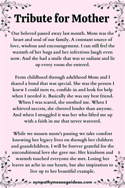 The legacy my mother leaves is one of profound kindness and enduring grace. She has touched the lives of so many with her gentle spirit and her compassionate heart. It’s not just within our immediate family that her influence is felt; her kindness extends to friends, neighbors, and even strangers. She has a unique ability to make people feel seen, heard, and valued. Whether it’s a listening ear, a helping hand, or a warm smile, her actions always speak volumes about her generous nature. I’ve witnessed her go out of her way, time and time again, to assist others, often without seeking any recognition for her efforts. This selfless dedication to helping those around her is a powerful lesson in empathy and compassion. She has shown me that true fulfillment comes not from what we gain, but from what we give. Her grace in handling difficult situations, her ability to respond with understanding rather than anger, has always been remarkable. She has taught me the importance of maintaining dignity and composure, even when faced with challenging circumstances. This legacy of kindness and grace is not just a set of admirable qualities; it is a way of life, a philosophy that has shaped her interactions and left an indelible positive mark on everyone she encounters. It’s a legacy that inspires me to be a better person, to strive for kindness in my own actions, and to approach the world with the same gentle spirit she embodies. Her influence is a guiding light, a constant reminder of the impact one person can have through simple acts of goodness and unwavering compassion. This enduring spirit of generosity and poise is the most precious inheritance she could have possibly bestowed upon me, shaping my worldview and my interactions with the world in ways I will forever be grateful for.