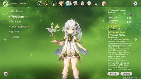 - A Thousand Floating Dreams (5-Star): This is Nahida’s signature weapon and the best choice for her. It provides a massive amount of Elemental Mastery and buffs the damage of other party members based on their elemental types. If you have this weapon, definitely use it on Nahida.