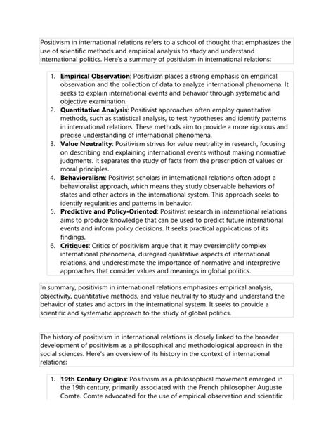 Hey guys, let’s dive deep into the positivist approach in international relations . It’s a pretty fundamental concept, and understanding it will really unlock a lot of how we analyze global politics. Basically, positivism is all about empiricism – that means we should focus on what we can observe, measure, and test. In the world of IR, this translates to looking at concrete data, like trade figures, military spending, treaties signed, and voting patterns in the UN. Positivists believe that we can uncover objective truths about how states interact by studying these observable phenomena. They’re not really interested in people’s intentions, beliefs, or abstract theories unless those things can be directly linked to observable actions. Think of it like a scientist in a lab, carefully recording data and looking for patterns. Positivists in IR aim to do the same, but with the complex interactions between countries. They want to build theories that are falsifiable , meaning there’s a possibility to prove them wrong with evidence. This is a huge departure from earlier approaches that might have relied more on philosophical reasoning or moral arguments. They aim for scientific objectivity , trying to remove personal biases and subjective interpretations from the analysis. So, when you hear about positivism in IR, picture scholars poring over datasets, building statistical models, and trying to find generalizable laws or patterns that explain why states do what they do on the world stage. It’s about moving beyond ‘what if’ scenarios and focusing on ‘what is’ and ‘what has been,’ grounded in verifiable facts. This approach has been super influential, shaping a lot of quantitative research in the field and pushing for more rigorous, evidence-based analysis.