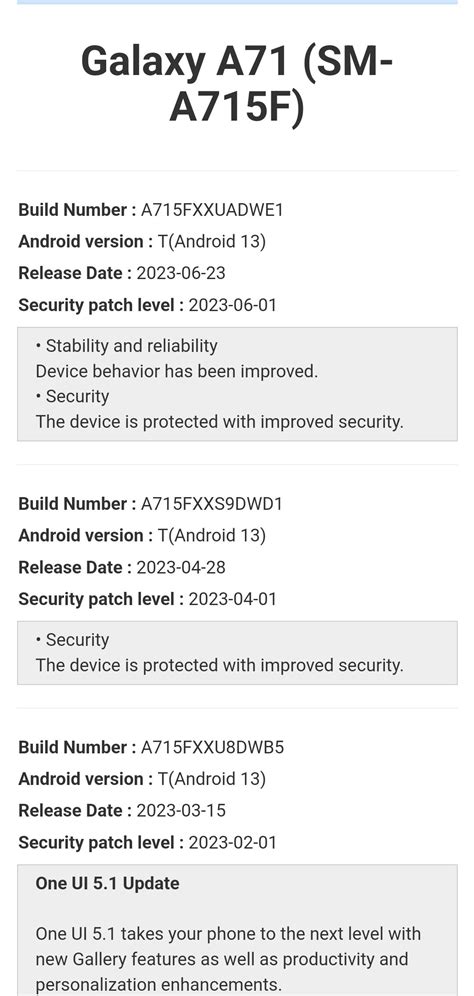 When it comes to Samsung Galaxy A71 update support , it’s crucial to understand the expected timeline. Samsung generally provides a defined update policy for its smartphones. This policy dictates the number of major Android updates and the duration of security updates. For the A71, which was released a few years ago, the update policy has already played out. As mentioned, the phone received updates to Android 11 and Android 12. The A71 is no longer eligible for further major Android version updates. However, Samsung continues to roll out security patches to ensure that the device remains secure against potential vulnerabilities. These security updates are released periodically, and their frequency depends on factors such as the device’s age and the severity of identified security threats. Typically, the frequency of security updates decreases over time, but Samsung strives to keep the device secure for as long as possible. The update timeline for the A71 aligns with the standard support provided by Samsung for its mid-range devices. Knowing the update expectations helps you manage your expectations and plan accordingly. Since major Android updates have ceased, it’s essential to focus on staying updated with the security patches. Regularly checking for and installing these patches will help you protect your device from potential security risks. Furthermore, understanding the update timeline helps you assess the device’s lifecycle and determine when a potential upgrade might be necessary. Staying informed through official sources, such as Samsung’s website and tech news outlets, provides the most accurate and up-to-date information regarding the A71’s software support. Therefore, being proactive in keeping your device updated is the key to maintaining a secure and efficient experience.