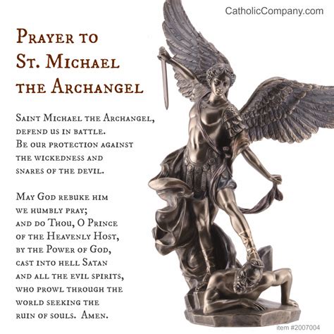 • “St. Michael the Archangel, defend us in battle. Be our protection against the wickedness and snares of the devil; May God rebuke him, we humbly pray; and do thou, O Prince of the Heavenly Host, by the power of God, thrust into hell Satan and all evil spirits who prowl about the world seeking the ruin of souls. Amen.”