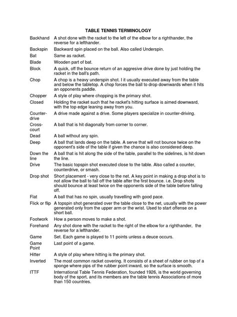 Beyond individual terms, several common phrases and expressions are used in the world of table tennis. These phrases often relate to specific shots, strategies, or game situations. Understanding these expressions will help you better understand the nuances of the game and communicate more effectively with other players and coaches. For example, you might hear terms like “topspin,” “backspin,” or “sidespin” to describe the rotation imparted on the ball. These types of spin can significantly affect the ball’s trajectory and bounce, making them important tools for offensive and defensive play. You might also hear terms like “smash,” “loop,” “block,” or “push” to describe different types of shots. A smash is a powerful overhead shot, while a loop is a shot with heavy topspin. A block is a defensive shot used to return an opponent’s attack, and a push is a soft shot used to keep the ball low and close to the net. Other common phrases include “service,” “receive,” “rally,” and “point.” The service is the act of starting the game by hitting the ball over the net. The receive is the act of returning the serve. A rally is a sequence of shots between two players, and a point is awarded to the player who wins the rally. By learning these common phrases and expressions, you’ll be able to follow the action more closely and participate more fully in the table tennis community.