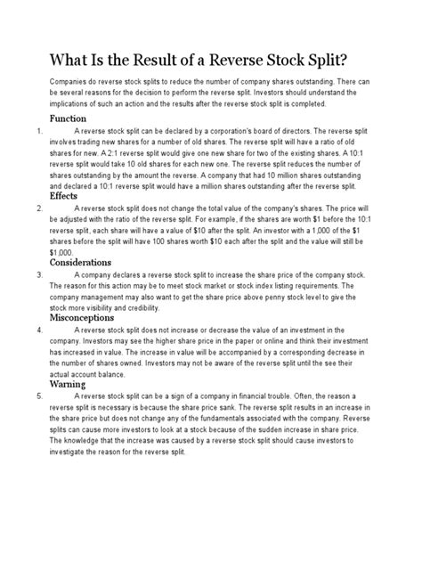 So there you have it, guys! We’ve navigated the intricacies of the 1 for 10 reverse stock split meaning . Remember, it’s a corporate action where a company reduces its number of outstanding shares, proportionally increasing the price per share. The primary motivations often revolve around meeting stock exchange listing requirements or improving the stock’s market perception. While the split itself doesn’t change the total value of your investment, it’s crucial to understand the implications. The effect on your share count and price is straightforward math, but watch out for fractional shares and potential impacts on liquidity. The signal a reverse split sends is often bearish, indicating underlying business challenges, though it can be part of a larger turnaround strategy. Always do your homework and consider the company’s overall financial health and future prospects beyond just this one corporate action. Understanding these maneuvers is key to making informed investment decisions. Keep learning, stay curious, and happy investing!